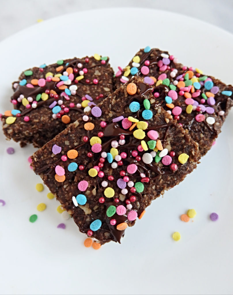 Yo los decoré con chispitas por el “mood” cumpleañero. Derretí un poco de chocoalte y luego agregué las chispas para que se viera muy festivo.