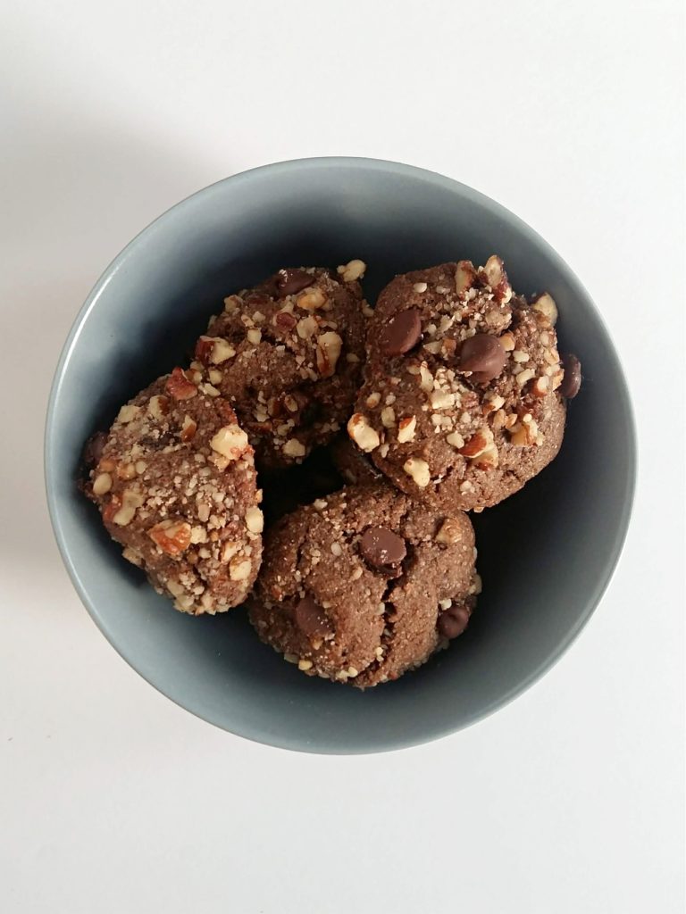 Las galletas que hice fueron unas de chocolate rellenas de dátil cubiertas de nuez. La idea era que fueran como los chocolates tortuguitas, pero ya no quería salir de mi casa a buscar caramelo, así que lo hice con lo que tenía.