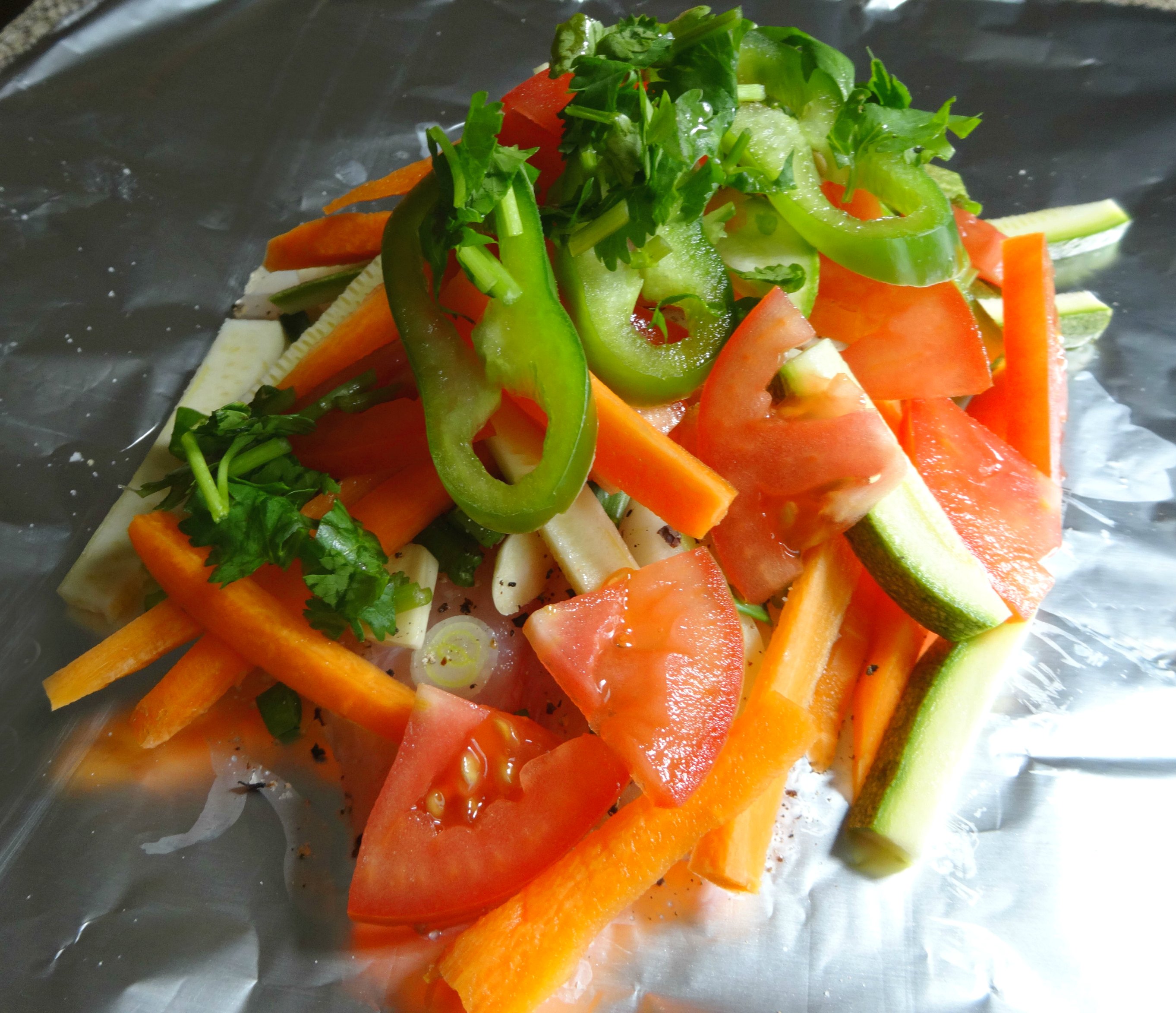 Esta vez use los vegetales a la mano, calabacita, zanahoria, cebolla, chile verde, tomate, ajo y no hay pierde. El truco para que el pescado agarre más sabor es ponerle encima la cebolla y el ajo y salpimentar, ya después el resto de las verduras y otra vez salpimentar, así tanto el pescado como las verduras van a ser una sabrosura. Y si quieres un extra y no te andas cuidando de las grasas, échale media cucharadita de aceite de coco o mantequilla, y en 12 minutos tendrás una deliciosa comida.