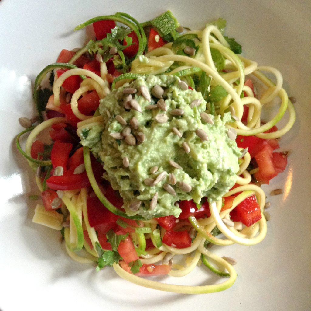 Pero no había hecho el básico, znoodles, así que para entretenerme un rato hice los znoodles y decidí bañarlos en una crema de aguacate que no tiene crema, y le puse las verduritas que se me atravesaron, unas semillas de girasol y ahí tienes una cena o ensalada deliciosa.